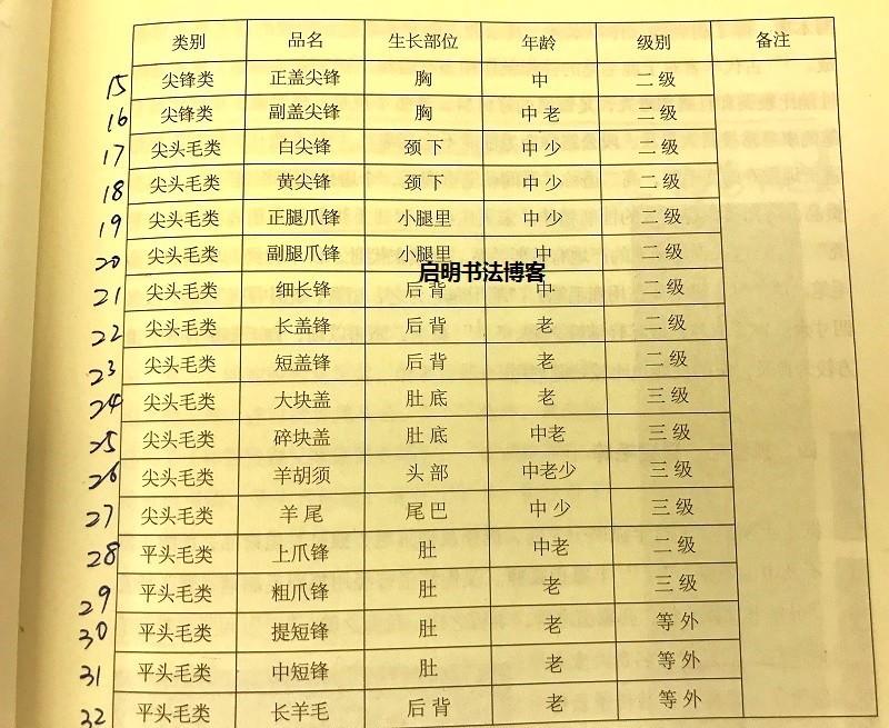 In Teacher Li Zhaozhi’s book “Chinese Calligraphy Brushes” (page 40), he categorizes goat hair used for making Chinese brushes into four major types based on the hair shaft and tip: Guangfeng (glossy tip), Jianfeng (sharp tip), Jiantou (pointed head), and Pingtou (flat head).