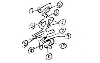 Second character, “shan” (善): The stroke sequence follows: outer-inner-inner-outer-inner-outer-inner-inner-outer-inner-outer